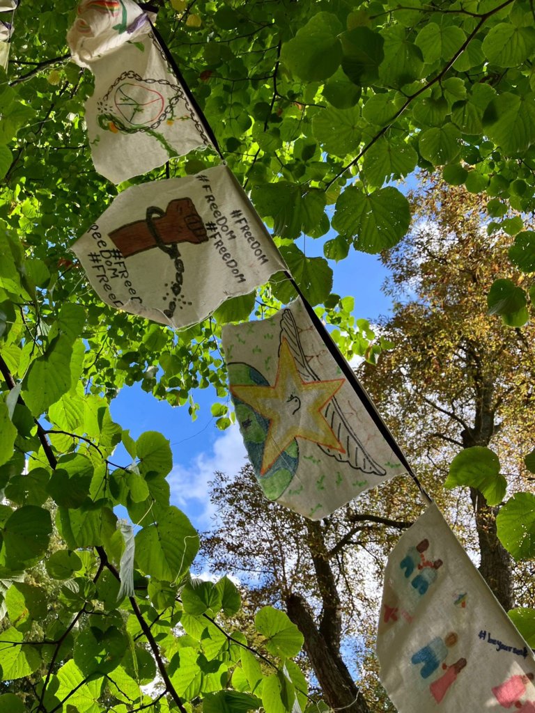 De vlaggen zijn gemaakt door alle leerlingen uit klas 2. Alle tweede klassen hebben tijdens de introductiedag een rondleiding gehad in het museum en zijn tijdens de rondleiding langs kunstwerken gekomen die als thema vrijheid hebben. Bij tekenen en handvaardigheid zijn zij aan de slag gegaan met de vraag: wat betekent vrijheid voor jou? Dit alles hebben zij verwerkt in vlaggen die nu wapperen in de museumtuin.
